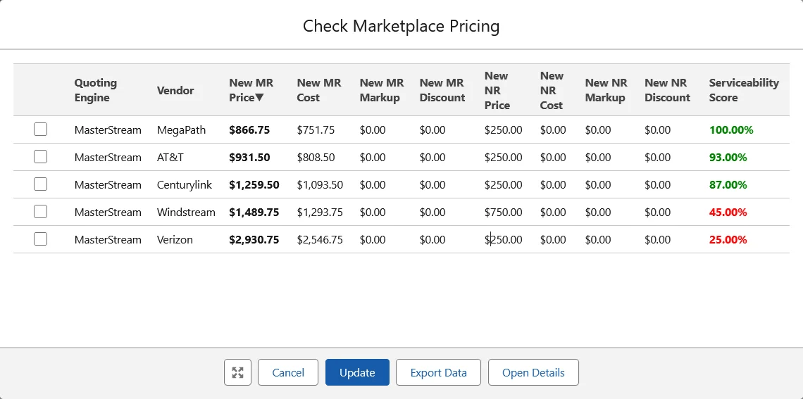 Traditional price books are insufficient for telecommunications. Pricing must account for multiple dimensions such as bandwidth, service location, access type, contract term, and transport technology. Providers must also match internal offerings with third-party vendor products and dynamically calculate margins based on cost inputs.